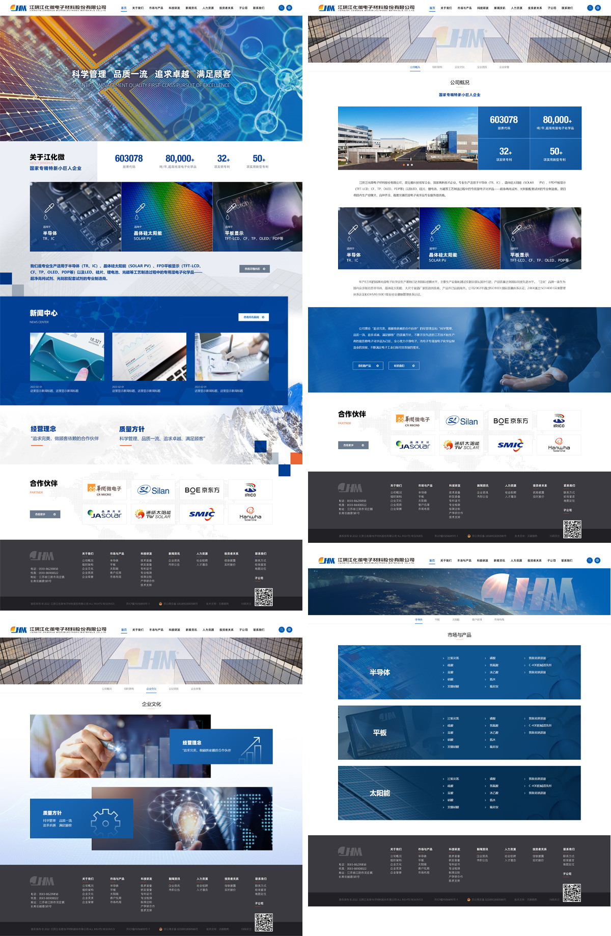 江陰江化微電子材料股份有限公司成立于2001年,江蘇省高新技術(shù)企業(yè),中國電子化工新材料產(chǎn)業(yè)聯(lián)盟副理事長單位,2016年中國半導(dǎo)體材料十強(qiáng)企業(yè),2019年中國電子化工材料專業(yè)十強(qiáng),2021年獲國家級(jí)專精特新小巨人企業(yè)稱號(hào),2017年4月在上交所主板掛牌上市,股票代碼:江化微603078。由于疫情反復(fù),網(wǎng)站建設(shè)工作經(jīng)歷了一個(gè)漫長的過程后終于圓滿完成,并通過客戶領(lǐng)導(dǎo)審核上線。無錫獵豹在為客戶提供服務(wù)的過程中不斷成長,急客戶之所急,想客戶之所想,在自己專業(yè)領(lǐng)域?yàn)榭蛻籼峁┡c之匹配的解決辦法,為客戶降本增效。